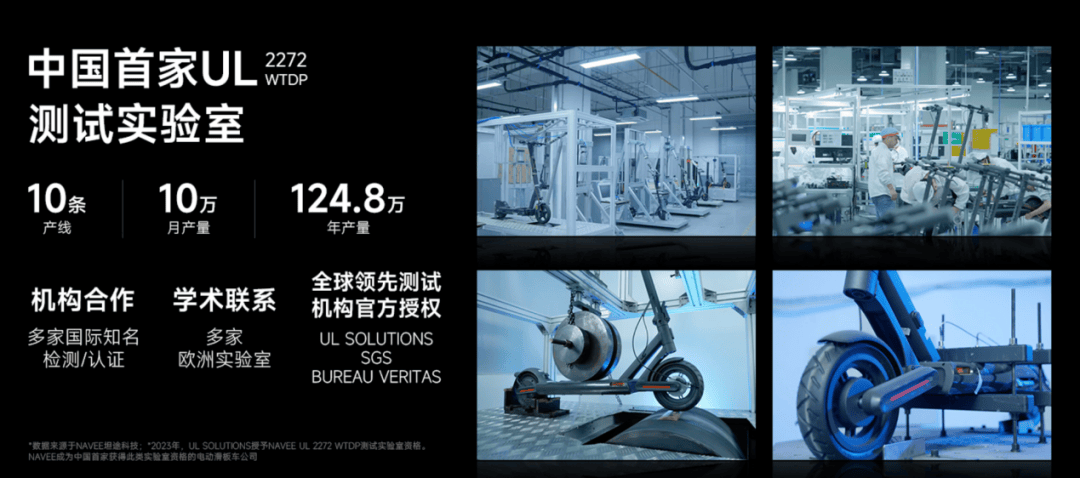 截至目前,NAVEE已累计申请专利342项,其中199项获授权,并在ID设计、减震性能与爬坡能力三大维度实现行业领先。尤为关键的是,其成为中国首家获得UL 2272 WTDP实验室资质的企业,可自主完成全球主流市场的安全认证。所有产品上市前需通过140余项严苛测试,涵盖TUV Rheinland、SGS、BV、UL等国际权威标准。这种对安全与质量的极致追求,不仅降低了合作伙伴的合规风险,更在全球市场树立了“中国智造”可靠、高标准的形象。